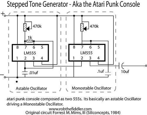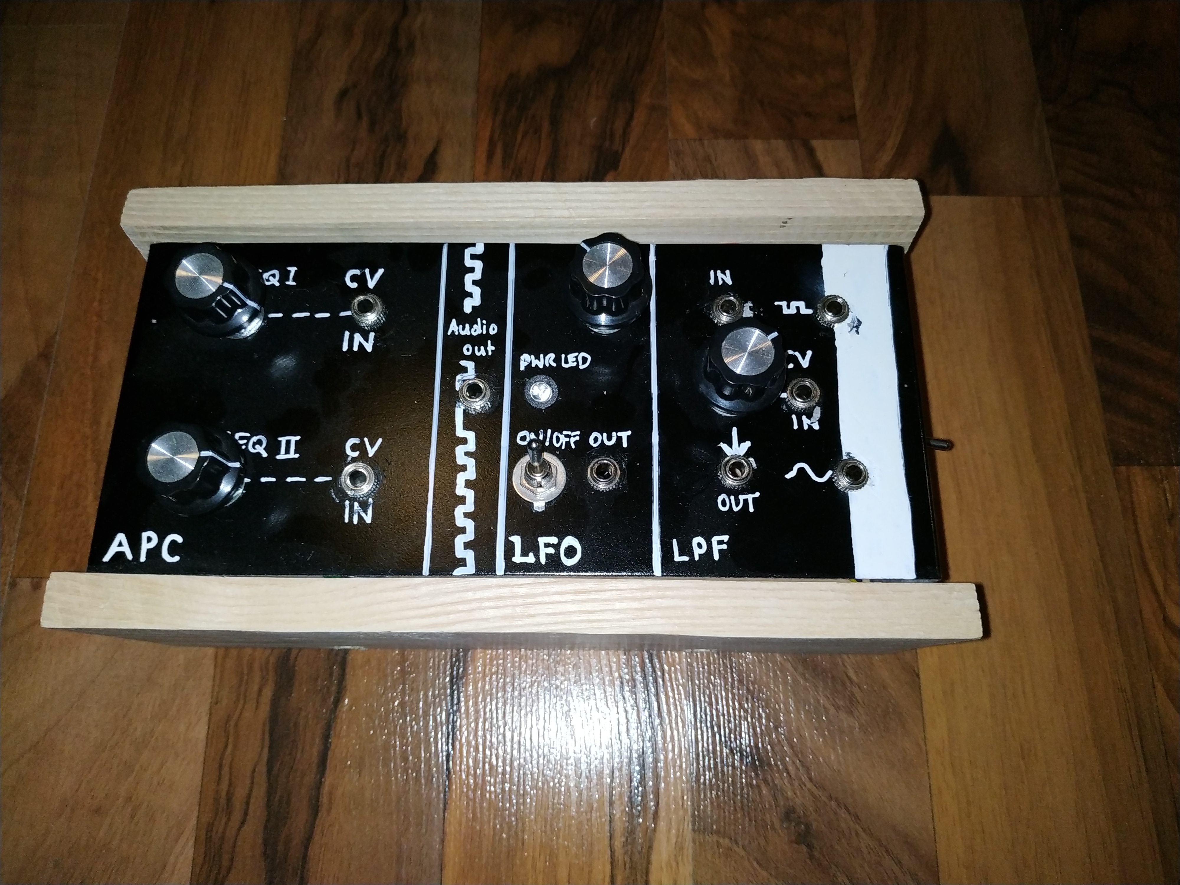 It is an Atari Punk Console a.k.a APC with a 555 LFO – worst design ever, don’t use in a modular or you’ll get serious bleedthrough issues, and two filters, one RC lowpass with a vactrol and a pot in parallel and one RC ladder to soften the squarewaves which works fine.