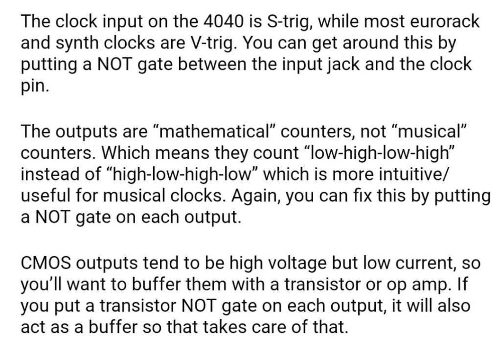 This clock divider is pretty easy to build and there is no schematic because I simply built it using the datasheet. I found one that seems safe to use and some more info for builders. All in all it works and I use it for drum modules with gate to trigger converters some times or as suboscillators for squarewaves. Both worked fine so far.