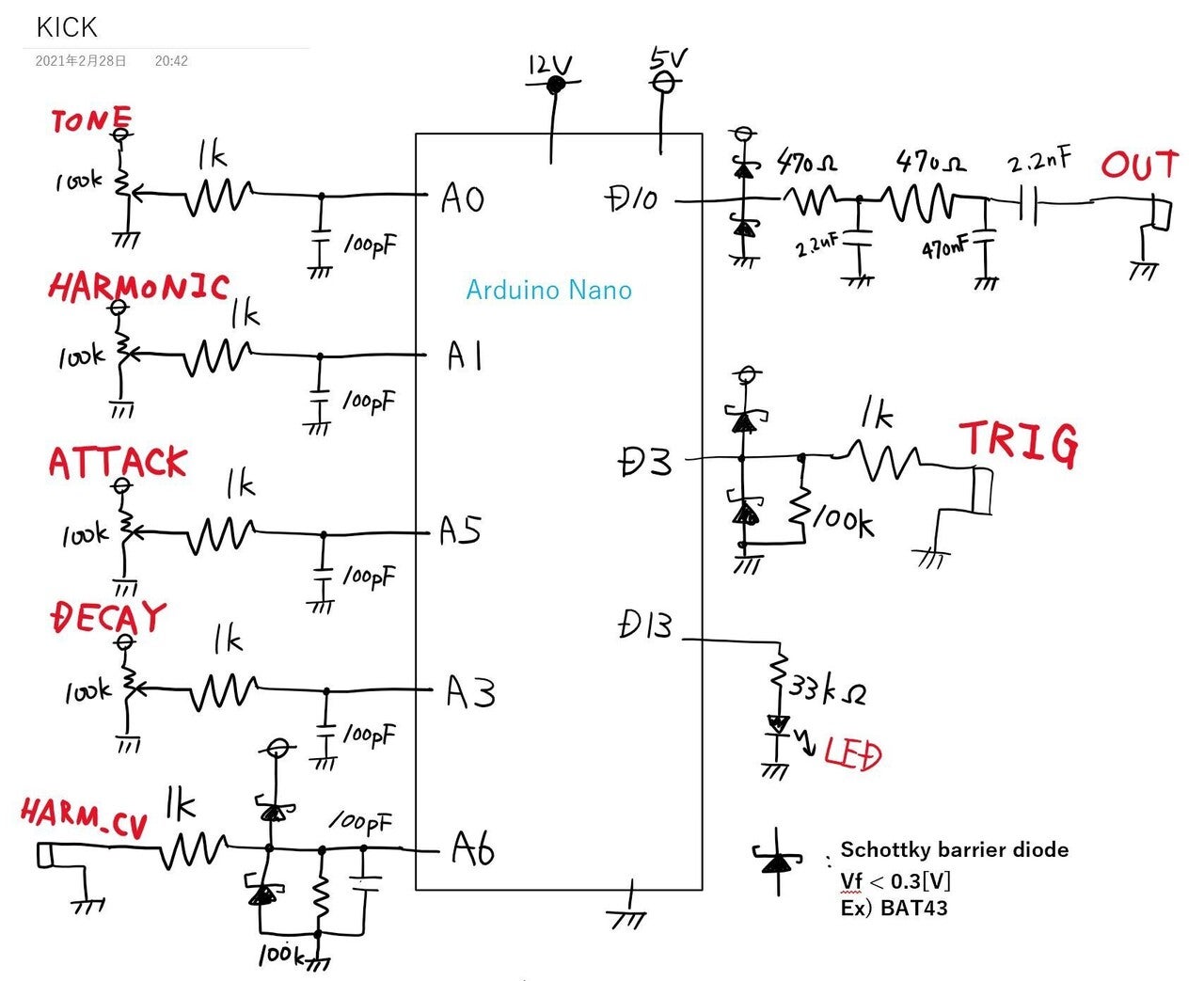 It was my third hagiwo build and it was pretty straight forward. You get a couple of knobs to manipulate the sound: frequency, harmonic, decay, attack.