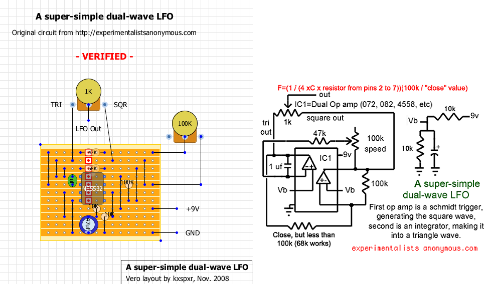 So about the build. I followed the original layout to the point of the wave mixing pot. I just left that one out – in hindsight not the best idea but the space was limited. For the second build I switched the timing cap for a 0.33uF one and the pot for a 500K one. That widened the frequency range – sadly not too much. If you need an LFO going really slow check out my other builds for example THIS one.