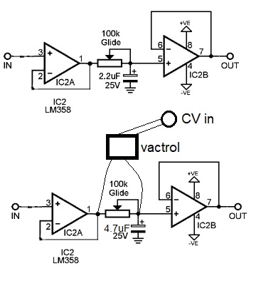 I searched for a simple slew limiter to add a glide effect. I found one and added CV using a simple vactrol.
