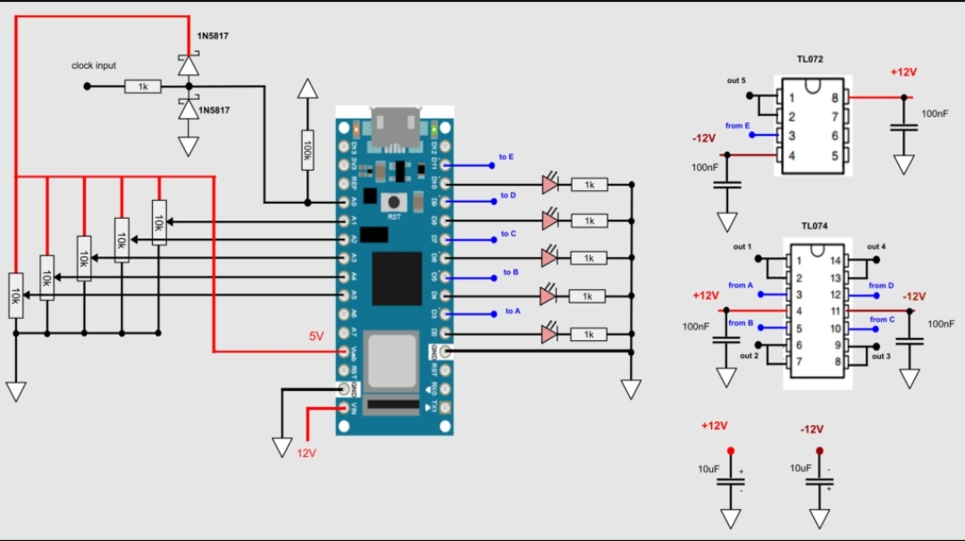 This module is great for adding a bit of randomness to sequences for example. You input a clock signal and output five variations of the same signal with different probabilities.