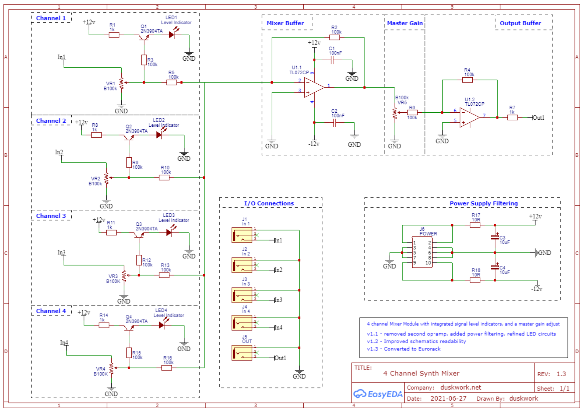 Every modular needs at least one mixer module and the LED indicators made this design interesting for me. This is one of the best (simple) mixers I’ve ever built.